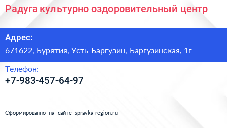 Радуга, культурно-оздоровительный центр по адресу 671622, Бурятия, Усть-Баргузин, Баргузинская, 1г в дальнейшем Организация, размещена в следующих категориях: