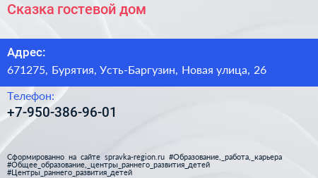 Сказка, гостевой дом по адресу 671275, Бурятия, Усть-Баргузин, Новая улица, 26 в дальнейшем Организация, размещена в следующих категориях: