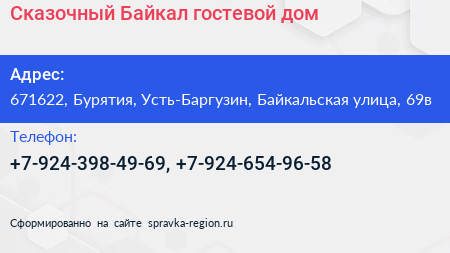 Сказочный Байкал, гостевой дом по адресу 671622, Бурятия, Усть-Баргузин, Байкальская улица, 69в в дальнейшем Организация, размещена в следующих категориях: