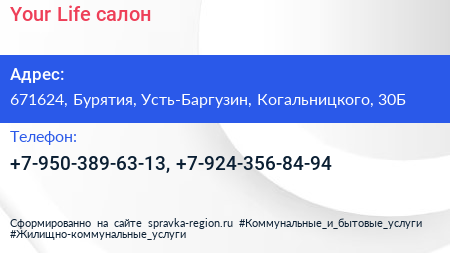 Your Life, салон по адресу 671624, Бурятия, Усть-Баргузин, Когальницкого, 30Б в дальнейшем Организация, размещена в следующих категориях: