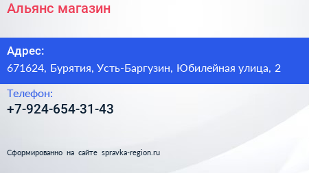 Альянс, магазин по адресу 671624, Бурятия, Усть-Баргузин, Юбилейная улица, 2 в дальнейшем Организация, размещена в следующих категориях: