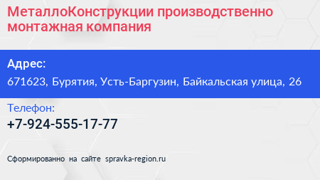 МеталлоКонструкции, производственно-монтажная компания по адресу 671623, Бурятия, Усть-Баргузин, Байкальская улица, 26 в дальнейшем Организация, размещена в следующих категориях: