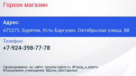 Горхон, магазин по адресу 671275, Бурятия, Усть-Баргузин, Октябрьская улица, 88 в дальнейшем Организация, размещена в следующих категориях: