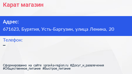 Карат, магазин по адресу 671623, Бурятия, Усть-Баргузин, улица Ленина, 20 в дальнейшем Организация, размещена в следующих категориях: