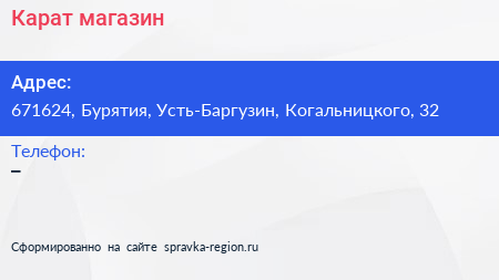 Карат, магазин по адресу 671624, Бурятия, Усть-Баргузин, Когальницкого, 32 в дальнейшем Организация, размещена в следующих категориях:
