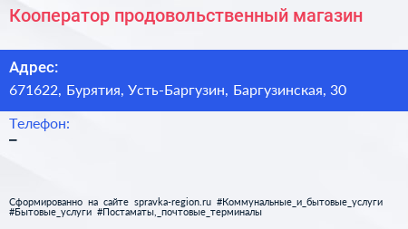 Кооператор, продовольственный магазин по адресу 671622, Бурятия, Усть-Баргузин, Баргузинская, 30 в дальнейшем Организация, размещена в следующих категориях: