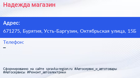 Надежда, магазин по адресу 671275, Бурятия, Усть-Баргузин, Октябрьская улица, 15Б в дальнейшем Организация, размещена в следующих категориях: