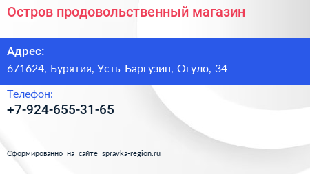 Остров, продовольственный магазин по адресу 671624, Бурятия, Усть-Баргузин, Огуло, 34 в дальнейшем Организация, размещена в следующих категориях: