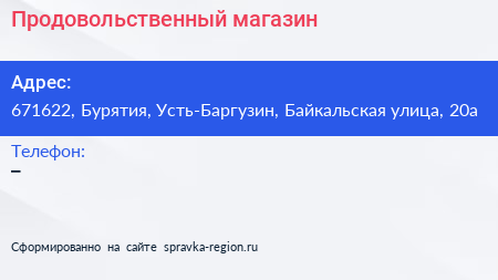 Продовольственный магазин по адресу 671622, Бурятия, Усть-Баргузин, Байкальская улица, 20а в дальнейшем Организация, размещена в следующих категориях: