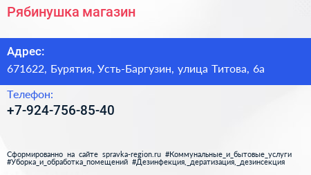 Рябинушка, магазин по адресу 671622, Бурятия, Усть-Баргузин, улица Титова, 6а в дальнейшем Организация, размещена в следующих категориях:
