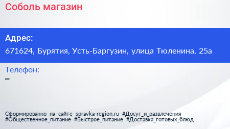 Соболь, магазин по адресу 671624, Бурятия, Усть-Баргузин, улица Тюленина, 25а в дальнейшем Организация, размещена в следующих категориях: