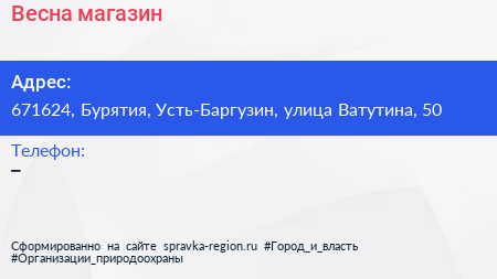 Весна, магазин по адресу 671624, Бурятия, Усть-Баргузин, улица Ватутина, 50 в дальнейшем Организация, размещена в следующих категориях: