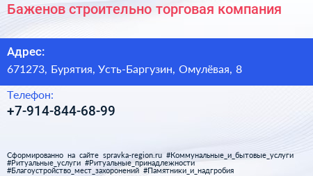 Баженов, строительно-торговая компания по адресу 671273, Бурятия, Усть-Баргузин, Омулёвая, 8 в дальнейшем Организация, размещена в следующих категориях: