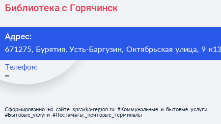 Библиотека, с. Горячинск по адресу 671275, Бурятия, Усть-Баргузин, Октябрьская улица, 9 к13 в дальнейшем Организация, размещена в следующих категориях: