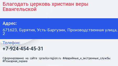 Благодать, церковь христиан веры Евангельской по адресу 671623, Бурятия, Усть-Баргузин, Производственная улица, 2 в дальнейшем Организация, размещена в следующих категориях: