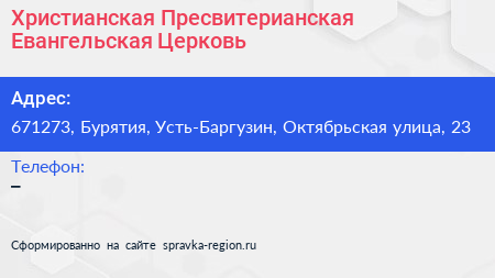 Христианская Пресвитерианская Евангельская Церковь по адресу 671273, Бурятия, Усть-Баргузин, Октябрьская улица, 23 в дальнейшем Организация, размещена в следующих категориях: