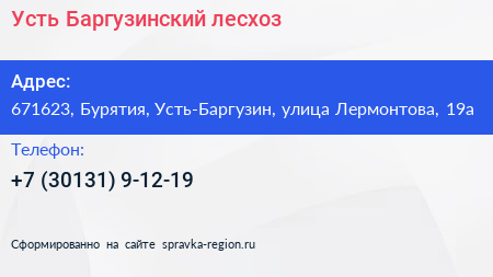 Усть-Баргузинский лесхоз по адресу 671623, Бурятия, Усть-Баргузин, улица Лермонтова, 19а в дальнейшем Организация, размещена в следующих категориях: