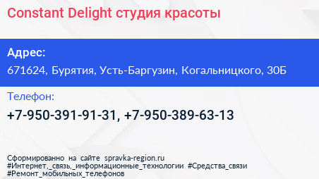 Constant Delight, студия красоты по адресу 671624, Бурятия, Усть-Баргузин, Когальницкого, 30Б в дальнейшем Организация, размещена в следующих категориях: