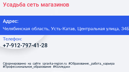 Усадьба, сеть магазинов по адресу Челябинская область, Усть-Катав, Центральная улица, 34Б в дальнейшем Организация, размещена в следующих категориях: