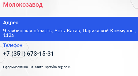 Молокозавод по адресу Челябинская область, Усть-Катав, Парижской Коммунны, 112а в дальнейшем Организация, размещена в следующих категориях: