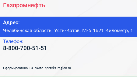 Газпромнефть по адресу Челябинская область, Усть-Катав, М-5 1621 Километр, 1 в дальнейшем Организация, размещена в следующих категориях: