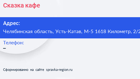 Сказка, кафе по адресу Челябинская область, Усть-Катав, М-5 1618 Километр, 2/2 в дальнейшем Организация, размещена в следующих категориях: