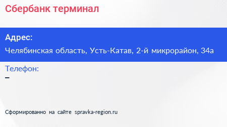 Сбербанк, терминал по адресу Челябинская область, Усть-Катав, 2-й микрорайон, 34а в дальнейшем Организация, размещена в следующих категориях: