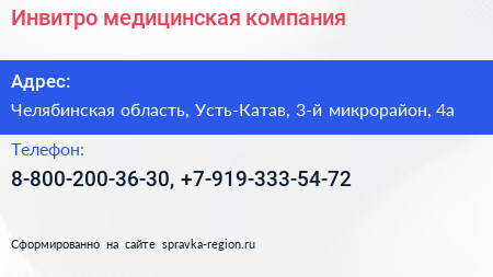 Инвитро, медицинская компания по адресу Челябинская область, Усть-Катав, 3-й микрорайон, 4а в дальнейшем Организация, размещена в следующих категориях: