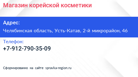 Магазин корейской косметики по адресу Челябинская область, Усть-Катав, 2-й микрорайон, 46 в дальнейшем Организация, размещена в следующих категориях: