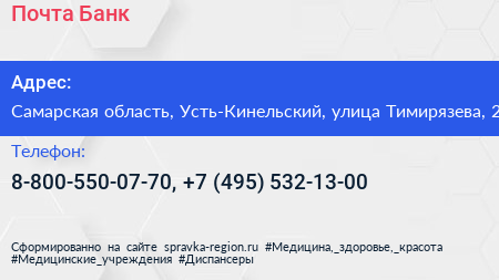 Почта Банк по адресу Самарская область, Усть-Кинельский, улица Тимирязева, 2 в дальнейшем Организация, размещена в следующих категориях:
