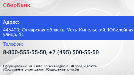 СберБанк по адресу 446403, Самарская область, Усть-Кинельский, Юбилейная улица, 11 в дальнейшем Организация, размещена в следующих категориях: