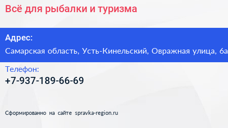 Всё для рыбалки и туризма по адресу Самарская область, Усть-Кинельский, Овражная улица, 6а в дальнейшем Организация, размещена в следующих категориях: