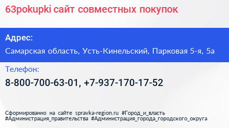 63pokupki, сайт совместных покупок по адресу Самарская область, Усть-Кинельский, Парковая 5-я, 5а в дальнейшем Организация, размещена в следующих категориях:
