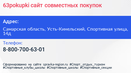 63pokupki, сайт совместных покупок по адресу Самарская область, Усть-Кинельский, Спортивная улица, 14д в дальнейшем Организация, размещена в следующих категориях: