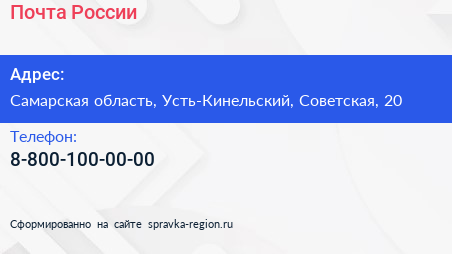 Почта России по адресу Самарская область, Усть-Кинельский, Советская, 20 в дальнейшем Организация, размещена в следующих категориях:
