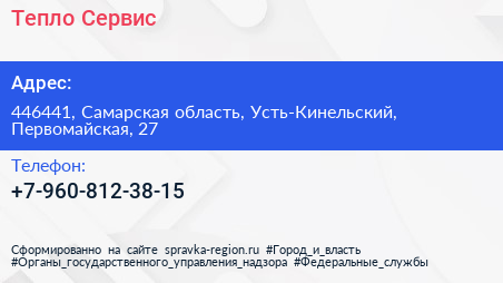 Тепло-Сервис по адресу 446441, Самарская область, Усть-Кинельский, Первомайская, 27 в дальнейшем Организация, размещена в следующих категориях: