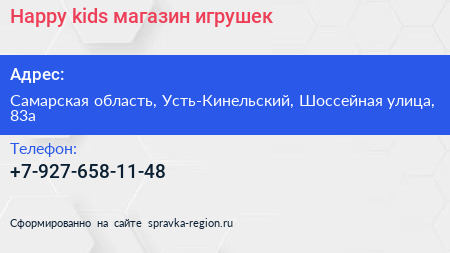 Happy kids, магазин игрушек по адресу Самарская область, Усть-Кинельский, Шоссейная улица, 83а в дальнейшем Организация, размещена в следующих категориях: