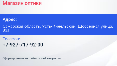 Магазин оптики по адресу Самарская область, Усть-Кинельский, Шоссейная улица, 83а в дальнейшем Организация, размещена в следующих категориях: