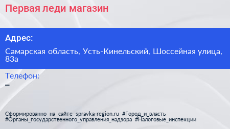 Первая леди, магазин по адресу Самарская область, Усть-Кинельский, Шоссейная улица, 83а в дальнейшем Организация, размещена в следующих категориях: