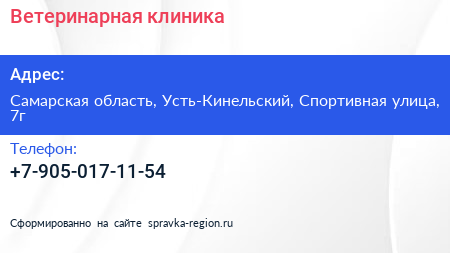 Ветеринарная клиника по адресу Самарская область, Усть-Кинельский, Спортивная улица, 7г в дальнейшем Организация, размещена в следующих категориях: