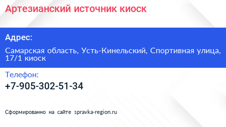 Артезианский источник, киоск по адресу Самарская область, Усть-Кинельский, Спортивная улица, 17/1 киоск в дальнейшем Организация, размещена в следующих категориях: