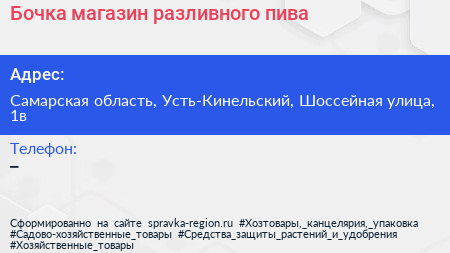 Бочка, магазин разливного пива по адресу Самарская область, Усть-Кинельский, Шоссейная улица, 1в в дальнейшем Организация, размещена в следующих категориях:
