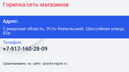 Горилка, сеть магазинов по адресу Самарская область, Усть-Кинельский, Шоссейная улица, 81в в дальнейшем Организация, размещена в следующих категориях:
