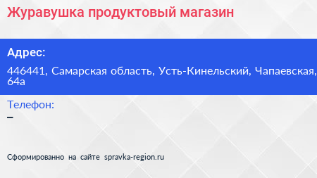Журавушка, продуктовый магазин по адресу 446441, Самарская область, Усть-Кинельский, Чапаевская, 64а в дальнейшем Организация, размещена в следующих категориях: