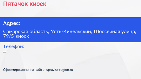 Пятачок, киоск по адресу Самарская область, Усть-Кинельский, Шоссейная улица, 79/5 киоск в дальнейшем Организация, размещена в следующих категориях: