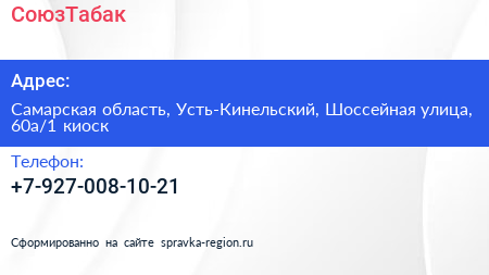 СоюзТабак по адресу Самарская область, Усть-Кинельский, Шоссейная улица, 60а/1 киоск в дальнейшем Организация, размещена в следующих категориях: