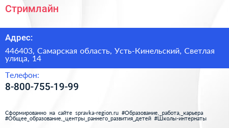 Стримлайн по адресу 446403, Самарская область, Усть-Кинельский, Светлая улица, 14 в дальнейшем Организация, размещена в следующих категориях:
