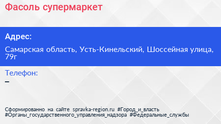 Фасоль, супермаркет по адресу Самарская область, Усть-Кинельский, Шоссейная улица, 79г в дальнейшем Организация, размещена в следующих категориях: