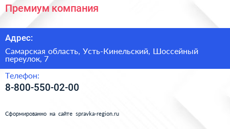 Премиум, компания по адресу Самарская область, Усть-Кинельский, Шоссейный переулок, 7 в дальнейшем Организация, размещена в следующих категориях: