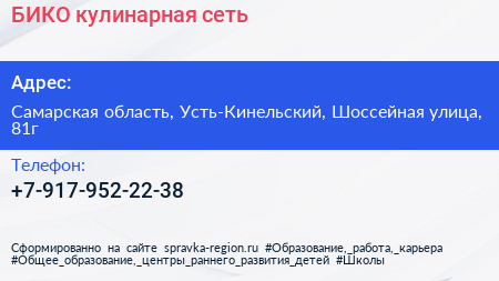 БИКО, кулинарная сеть по адресу Самарская область, Усть-Кинельский, Шоссейная улица, 81г в дальнейшем Организация, размещена в следующих категориях: